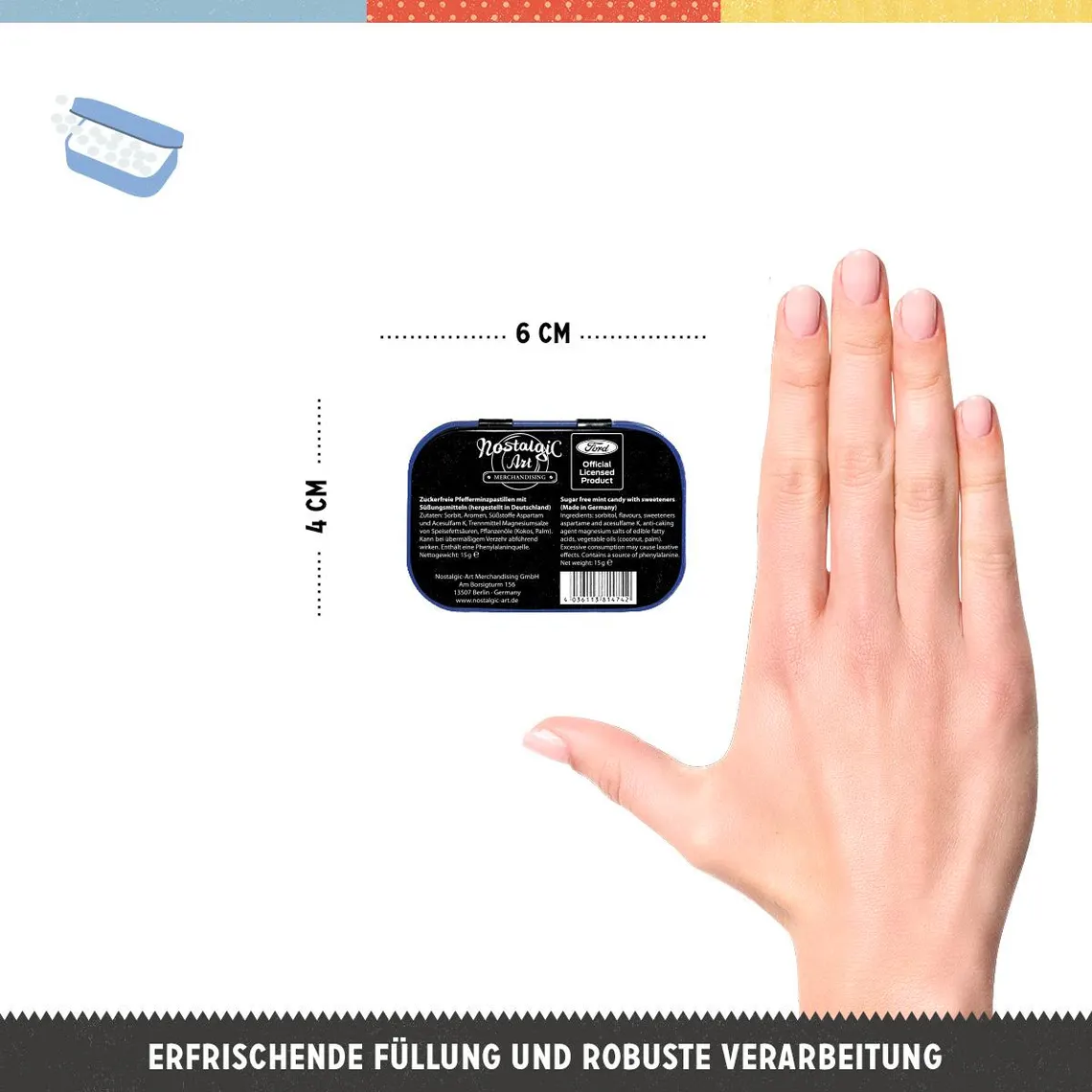 Cutia de buzunar este din metal si contine bomboane mentolate produse in Germania. Particularitatea produsului este prelucrarea in relief a imaginilor imprimate pe capac. Designul cutiilor de buzunar Nostalgic-Art este retro - aspectul exterior este lucios - reflexia luminii pune in valoare imaginea embosata. Dimensiuni: 4 x 6 x 1.6 cm. Bomboanele mentolate din interior sunt fara zahar - contin indulcitori. Gramaj: 15 gr. Termen de valabilitate - inscriptionat pe folia care sigileaza produsul.