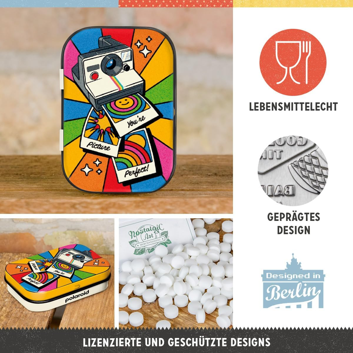 Cutia metalica de buzunar Polaroid - You're Picture Perfect! este o cutie din metal cu un design retro embosat.