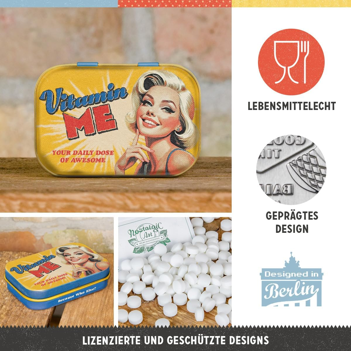Designul acestor cutii de buzunar Nostalgic-Art este retro, cu un aspect exterior lucios, care pune in valoare imaginea embosata. Sunt compacte (4 x 6 x 1,60 cm), ideale pentru a fi purtate in buzunar sau in geanta si contin bomboane mentolate , desi pot fi refolosite pentru depozitarea diverselor obiecte mici. Cutiile sunt apreciate pentru designul lor atractiv, calitatea metalului si caracterul practic.