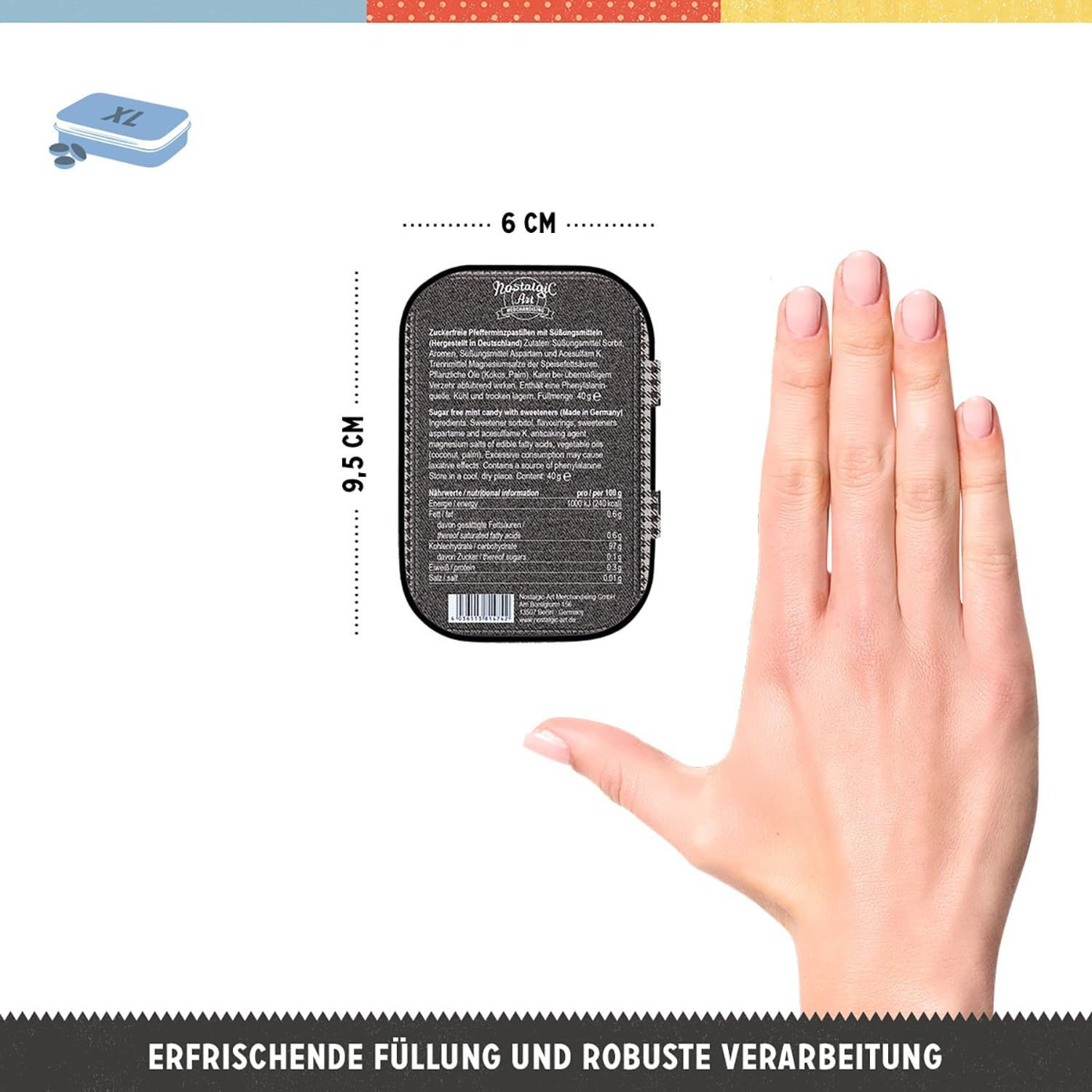 Caracteristici tehnice: Cutie XL "de buzunar" pentru bomboane; din otel; printata pe toate suprafetele; cu capac embosat si lacuit; rezistenta si atragatoare; ambalata in folie de plastic de protectie; contine bomboane mentolate produse in Germania; dimensiuni: 6x9.5x2cm.