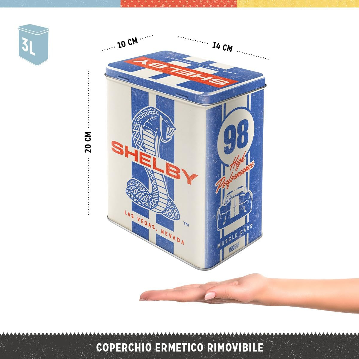 "Cutie Metalica marime L Shelby - Cobra Snake 98 nostalgic art" este o cutie metalica de depozitare produsa de Nostalgic Art, imprimata cu un design retro ce prezinta logo-ul si elementele masinii Shelby Cobra.