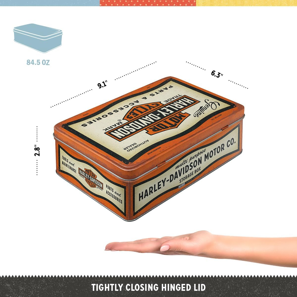 Aceasta cutie metalica este perfecta pentru a va pastra accesoriile si mici obiecte intr-un loc sigur si organizat. Cu dimensiunile de 23x16x17 cm, aceasta cutie este ideala pentru a fi amplasata pe un raft sau pe o masuta de cafea in camera de zi sau in garajul dvs. Mesajul "Harley-Davidson - Parts & Accessoires" gravat pe capacul cutiei adauga un aer autentic si retro, completand perfect designul sau metalic si aspectul sau robust. Acest produs nu este doar functional, ci si un accesoriu decorativ frumos pentru amatorii de motociclete Harley-Davidson. Produs cu liceenta