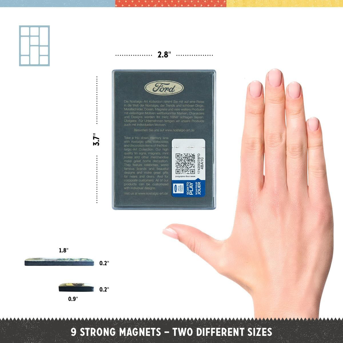 Caracteristici tehnice: Set magneti - contine 9 magneti puternici; de dimensiuni diferite; acoperiti cu diverse imagini protejate cu rasina epoxidica. Magnetii mici sunt patrati; cu latura de 2.2cm. Magnetii dreptunghiulari au dimensiunile 4.5x2.2cm. Magnetii sunt ambalati intr-o cutie de plastic transparent de dimensiuni mai mari decat a magnetilor din interior; 7x9.3x2cm.