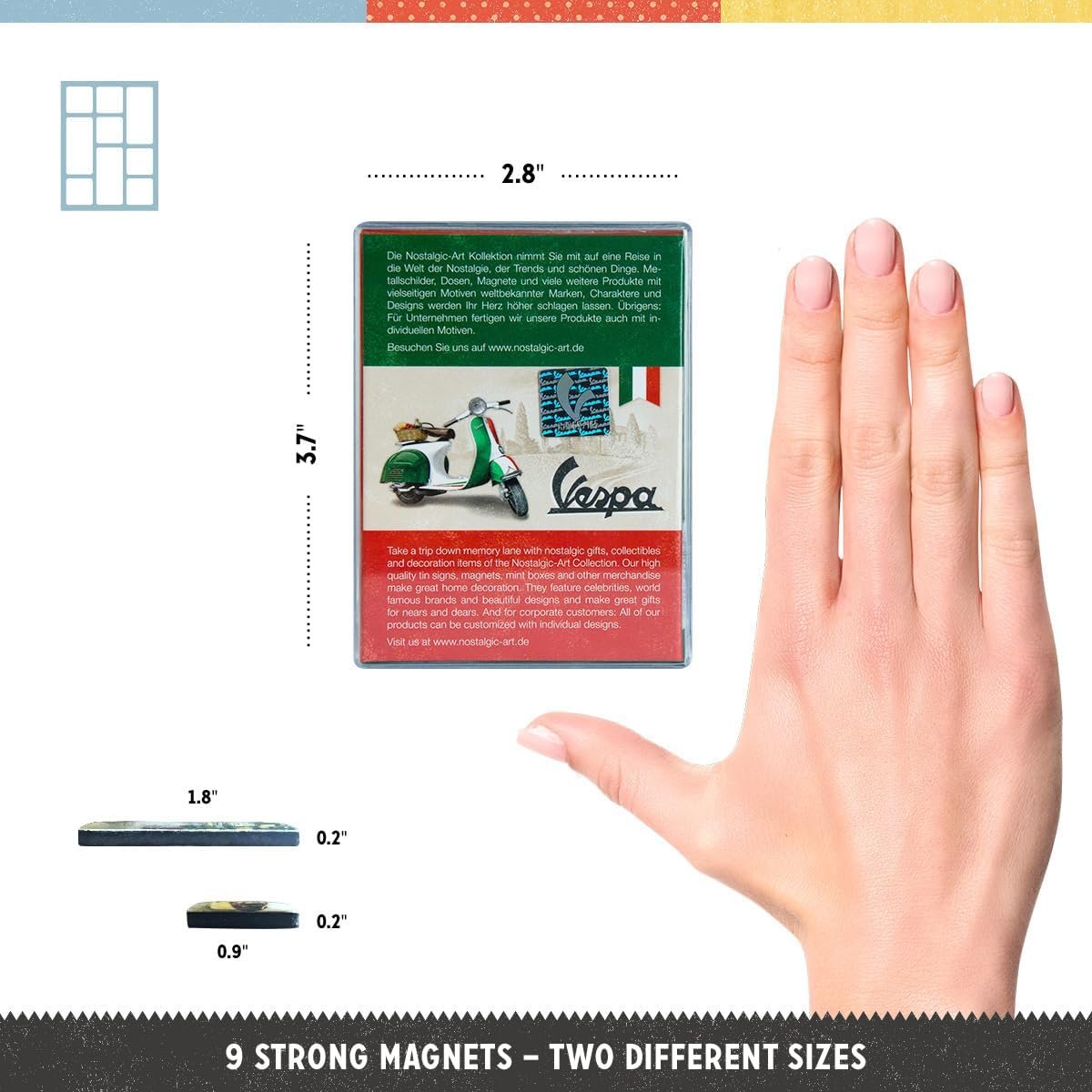Setul contine 9 magneti puternici, de dimensiuni diferite, acoperiti cu diverse imagini protejate cu rasina epoxidica. Magnetii mici sunt patrati, cu latura de 2.2 cm. Magnetii dreptunghiulari au dimensiunile 4.5 x 2.2 cm. Magnetii sunt ambalati intr-o cutie de plastic transparent de dimensiuni mai mari decat a magentilor din interior, 7 x 9.3 x 2 cm. Spatele cutiei contine o imagine reprezentativa pentru tema aleasa.