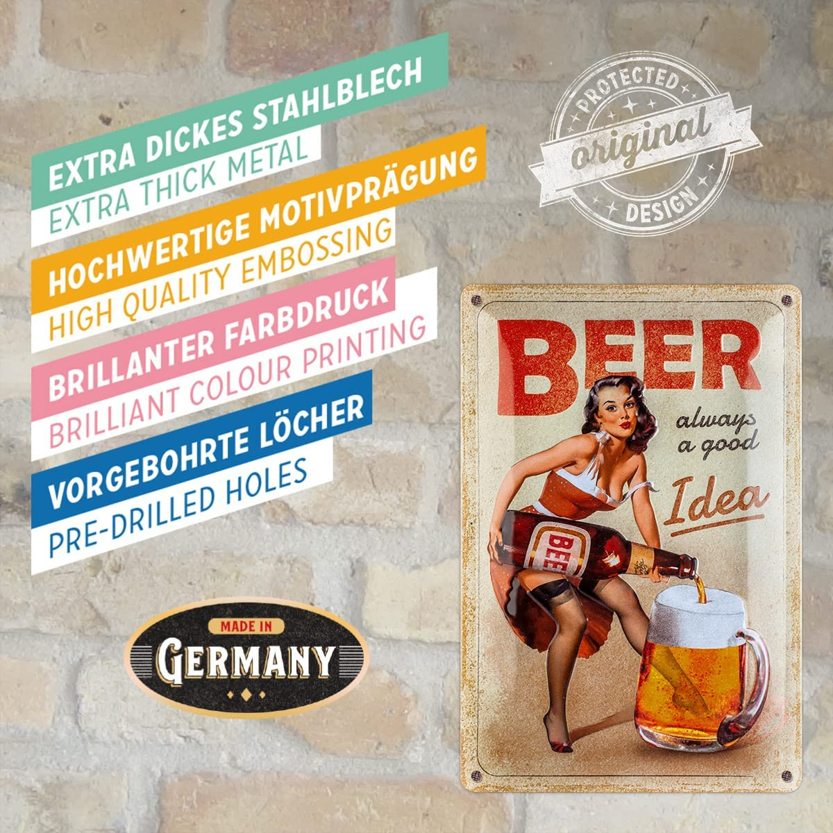 Aceasta placa decorativa metalica de perete cu dimensiunea de 20x30 cm este perfecta pentru a adauga o nota de distractie si bucurie in orice camera. Mesajul "Beer Always a Good Idea" este perfect pentru pasionatii de bere si pentru cei care apreciaza o buna gluma. Placa este usor de montat si de intretinut, fiind realizata dintr-un material durabil si rezistent. Este o alegere excelenta pentru a completa decorul unei bucatarii, a unui bar sau a unei camere de relaxare.