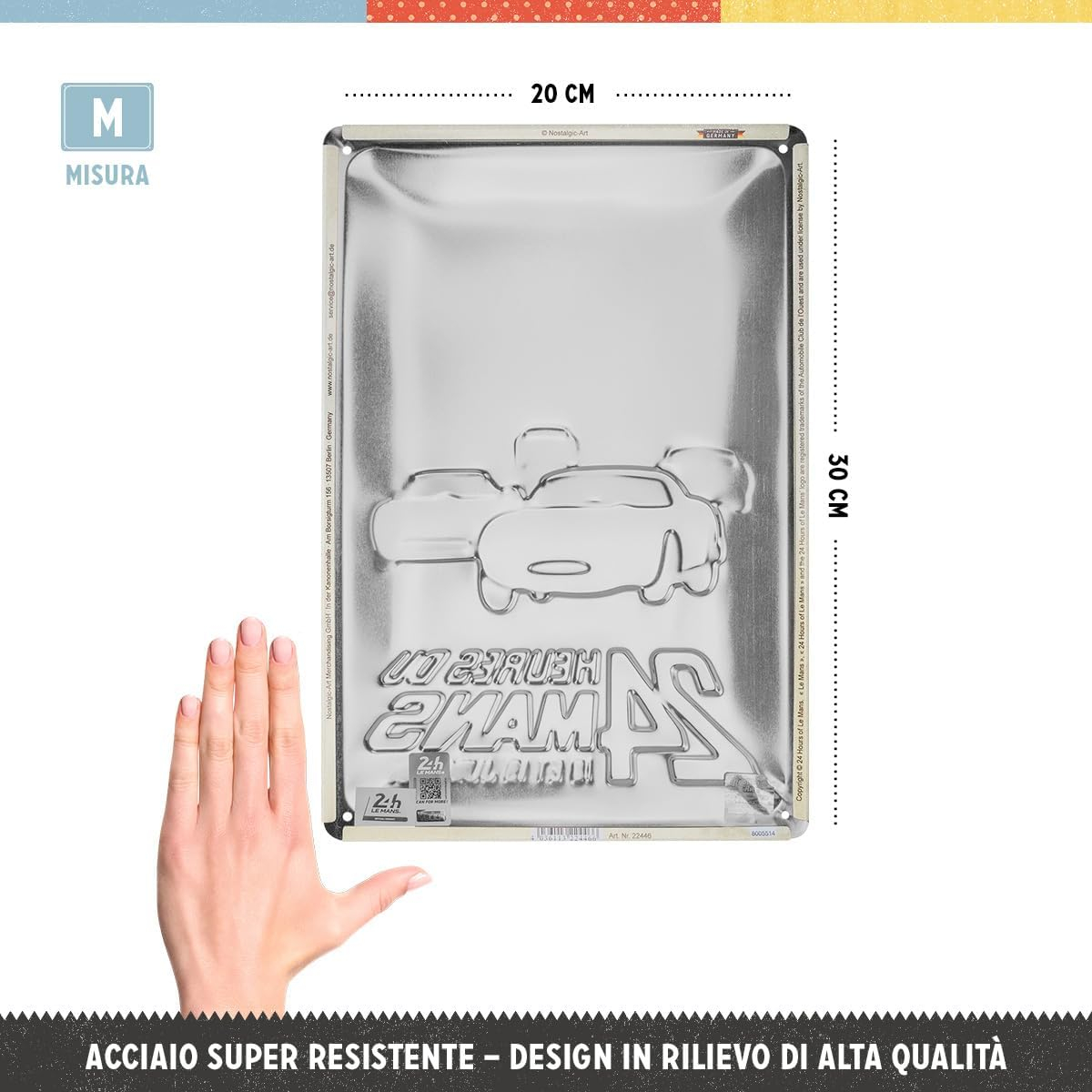 Design: Placa prezinta un motiv retro, de tip poster de curse, care este presat (embosat) in metal, nu doar imprimat pe o suprafata plana, oferind un efect deosebit prin reflexia luminii.