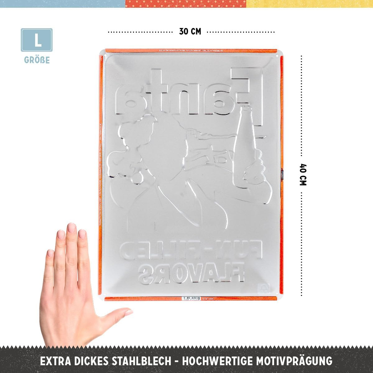 Placa de metal rigida, de grosime 0.5 mm; arcuita, embosata si lacuita pentru a crea un efect deosebit prin reflexia luminii; margine fasonata; colturi rotunjite si pregaurite. Placile sunt impachetate individual in folie de plastic. Dimensiuni: 30 x 40 cm.