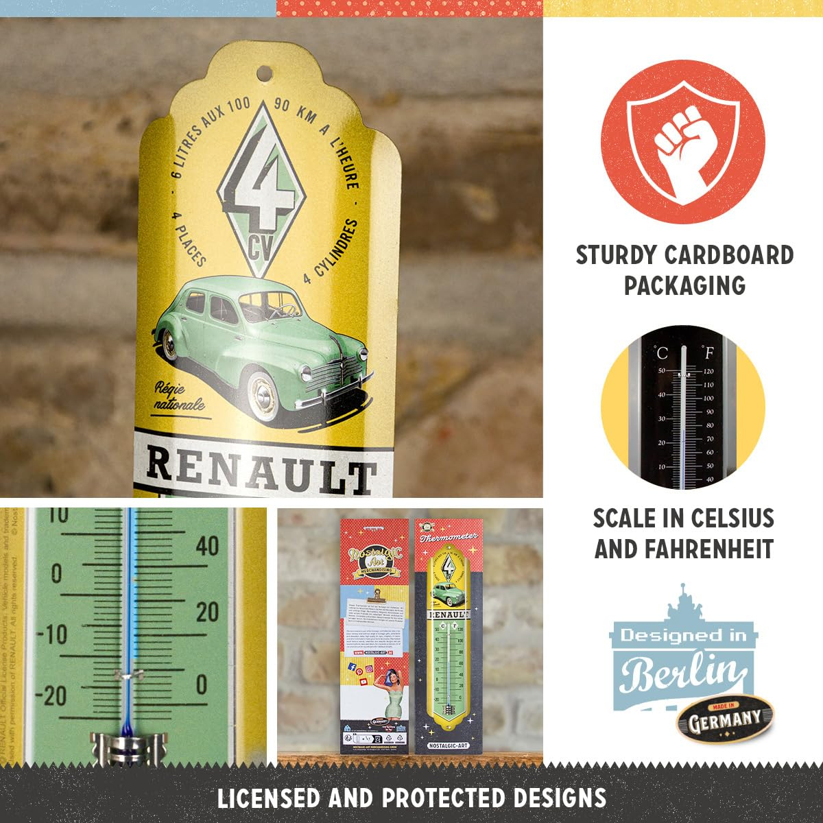 Aceste termometre sunt decorate cu logo-ul Renault si cu imagini ale modelului 4CV. Poate fi folosit atat ca element decorativ, cat si ca un instrument practic pentru a masura temperatura.